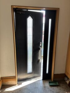 以前和室をリフォームしたお客様より玄関ドアの不具合の連絡が入り訪問しました。調査すると不具合を超えて壊れる寸前なのが発覚しました。急遽カバー工法の玄関ドアにて見積りをする事になりました。金具の交換程度と思い伺いましたが、かなり大掛かりな工事となりそうです。